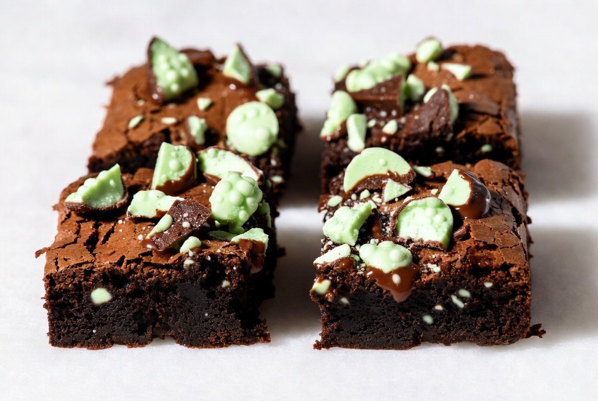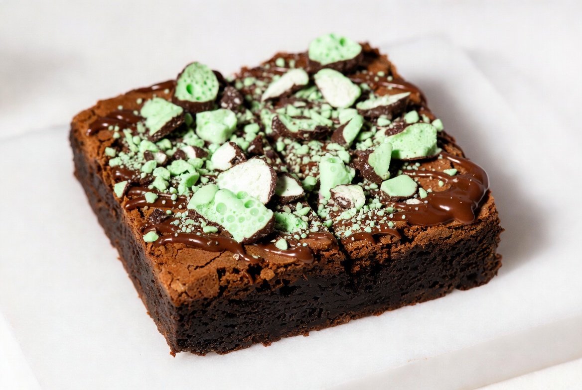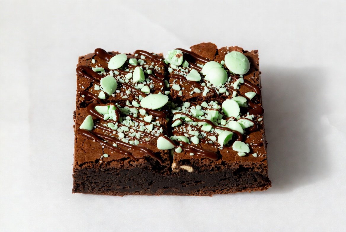 Each bite offers a perfect harmony of rich chocolate richness and refreshing minty flavor, creating a dessert that is both indulgent and invigorating. The brownie is thick, luscious, and visually appealing, with a slightly crisp top layer giving way to a soft, gooey, mint-chocolate center.