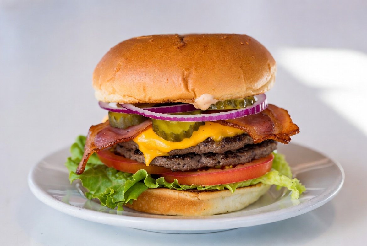 Crispy, smoky bacon adds a rich, savory crunch, while melted cheese brings creamy, indulgent richness to every bite. Fresh lettuce adds a crisp, refreshing texture that balances the flavors. The burger is completed with our signature sauce, tying all the elements together into a perfectly harmonious taste.