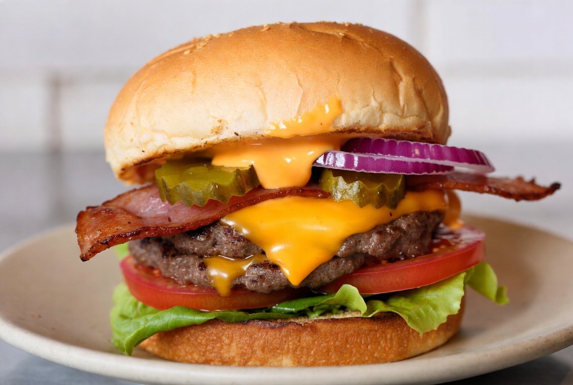 All ingredients are layered inside a soft, freshly toasted bun, ensuring the burger holds together while delivering a satisfying combination of juiciness, crunch, and creamy, savory flavor. Each bite provides a bold, memorable, and indulgent experience, ideal for lunch, dinner, or casual snacking.