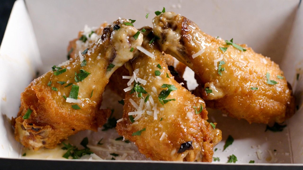 Melta Garlic & Parmesan Buffalo Classic Wings are juicy, crispy chicken wings coated in a creamy garlic and parmesan sauce with a subtle buffalo tang. Crispy on the outside and tender inside, these wings are perfect as a snack or meal. The rich garlic aroma and cheesy parmesan flavor make every bite irresistible, a must-try for anyone who loves classic, savory wings