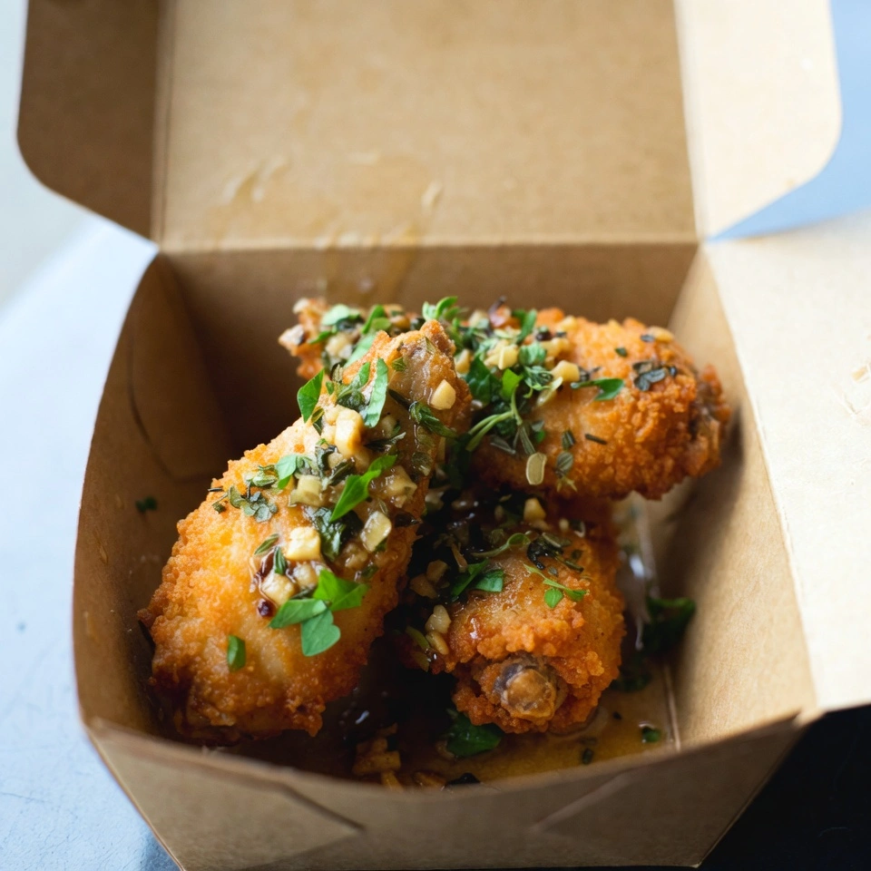 Melta’s Roasted Garlic & Herb Boneless Wings deliver a rich and savory flavor experience in every bite. Each piece is perfectly fried to a golden-brown crisp while remaining tender and juicy inside. The wings are lightly coated in a roasted garlic butter sauce that adds depth and warmth to the flavor. Visible bits of minced roasted garlic enhance the bold, aromatic taste. A blend of fresh herbs like parsley, oregano, and thyme adds a refreshing and earthy balance. The crispy outer layer provides the perfect contrast to the soft, succulent chicken within. The garlic flavor is smooth and well-balanced, never overpowering. Every piece is hand-tossed to ensure even seasoning and consistent taste. The buttery herb infusion creates a comforting yet refined flavor profile. The aroma alone is enough to awaken your appetite. These boneless wings are flavorful without feeling too heavy or greasy. Carefully prepared for a premium presentation, they look as good as they taste. The combination of roasted garlic and fresh herbs creates a timeless classic. Ideal for garlic lovers, this dish offers bold yet balanced seasoning. Melta’s signature recipe brings together comfort food and gourmet flavor in one unforgettable experience.